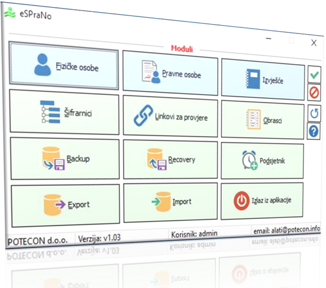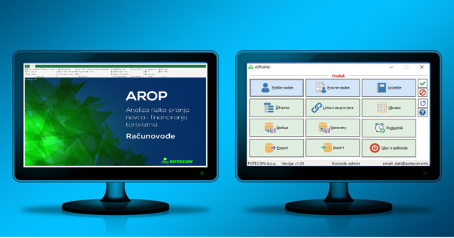 Informatičko rješenje za jednostavno i brzo usklađivanje sa zahtjevima sprječavanja pranja novca i financiranja terorizma, izvršavanje obveza i provođenje propisanih mjera te njihovo bilježenje u elektroničkom obliku. Osigurava jednostavno i brzo izvršavanje obveza osiguravajući usmjeravanje i pomoć istovremeno vodeći računa o specifičnostima djelatnosti korisnika. Namijenjen računovođama, ovlaštenim mjenjačima i posrednicima u prometu nekkretnina, uključćuje aplikacije AROP i eSPRANO.
